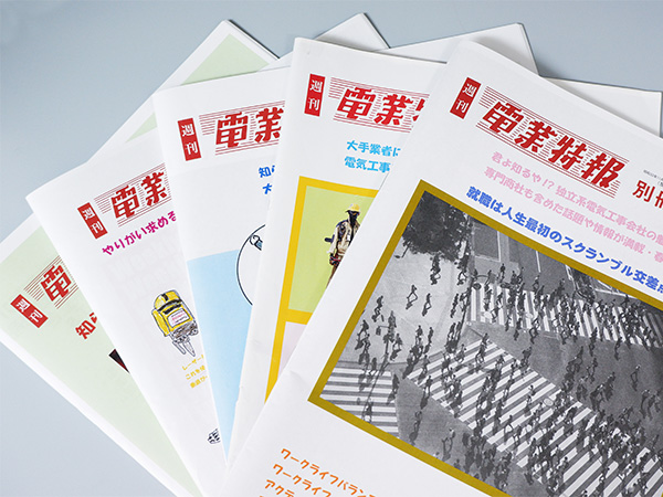 週刊電業特報別冊「就活特集号」は、毎年度4回発行しています。内容は、独立系電気設備工事会社(電材商社も含む)へ就職を目指す学生たちへの情報発信がメインです。
